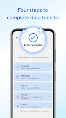 ASUS Phone Clone simplifică migrarea datelor esențiale. Transferă contactele, mesajele, fotografiile, videoclipurile și aplicațiile tale de pe orice dispozitiv Android vechi pe noul tău telefon ASUS. O tranziție rapidă și sigură.