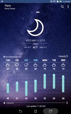 Cu **ASUS Weather**, aveți controlul deplin asupra planurilor zilnice și săptămânale. Descoperiți informații detaliate despre temperatura RealFeel®, prezentate prin diagrame intuitive, alături de predicții zilnice pentru maxime și minime. Beneficiați de o prognoză extinsă pe 7 zile, vitală pentru organizarea eficientă a activităților. Indicele UV, precum și orele exacte de răsărit și apus, sunt întotdeauna la îndemâna dumneavoastră. Pentru o accesibilitate sporită, adăugați widgetul **ASUS Weather** direct pe ecranul principal, personalizându-l pentru a afișa vremea din locația curentă, dintr-o destinație viitoare sau chiar dintr-un loc la care visați, oriunde pe glob.