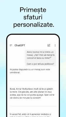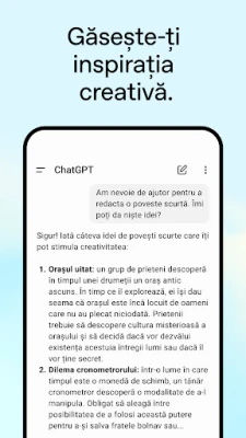 Fie că vizați inspirația creativă, consilierea adaptată nevoilor dumneavoastră sau învățarea personalizată, ChatGPT este soluția perfectă. Generați idei unice pentru cadouri de ziua de naștere, creați felicitări personalizate sau primiți îndrumare pentru a naviga situații complexe, formulând răspunsuri potrivite. Transformă învățarea într-o experiență captivantă: explicați concepte precum electricitatea unui copil fascinat de dinozauri sau reîmprospătați-vă cunoștințele despre evenimente istorice cu ușurință. Pe plan profesional, sprijină brainstorming-ul pentru texte de marketing sau elaborarea planurilor de afaceri. Și nu în ultimul rând, obțineți răspunsuri instantanee, precum sugestii de rețete bazate pe ingredientele pe care le aveți la dispoziție.